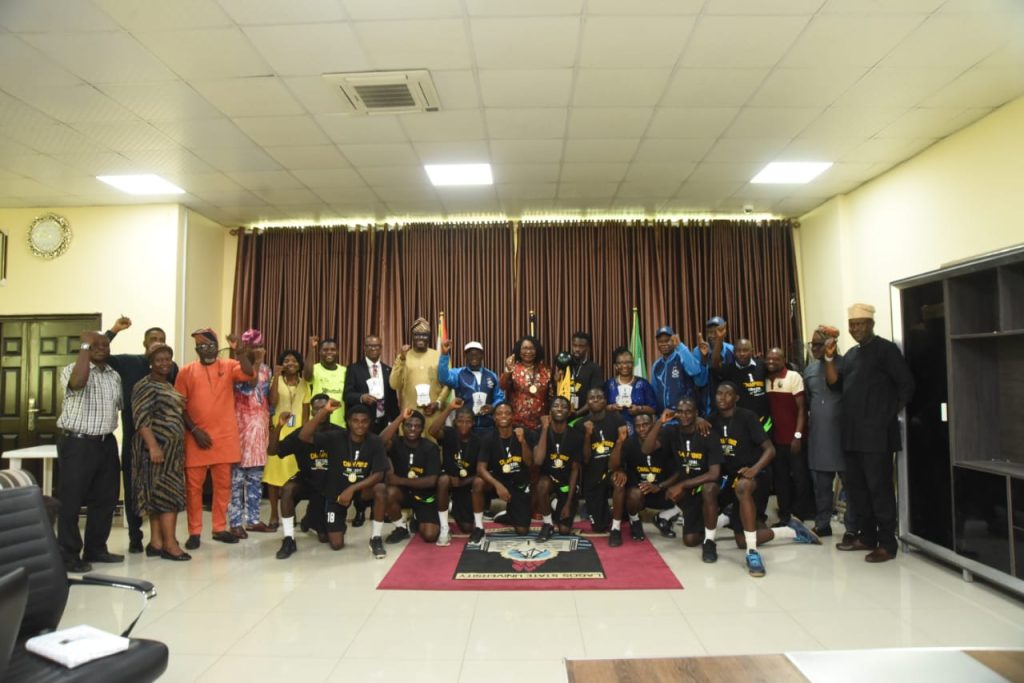 The Vice-Chancellor, Lagos State University (LASU), Professor Ibiyemi Olatunji-Bello, mni, NPOM, and members of the university management received and hosted the all-conquering UNITECOL champions, LASU Trail Blazers on Wednesday, 7th May 2025. The short but colourful event held at the Vice-Chancellor’s Conference Room, 6th Floor, Babatunde Raji Fashola Senate Building, LASU Main Campus, Ojo, Lagos.